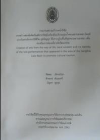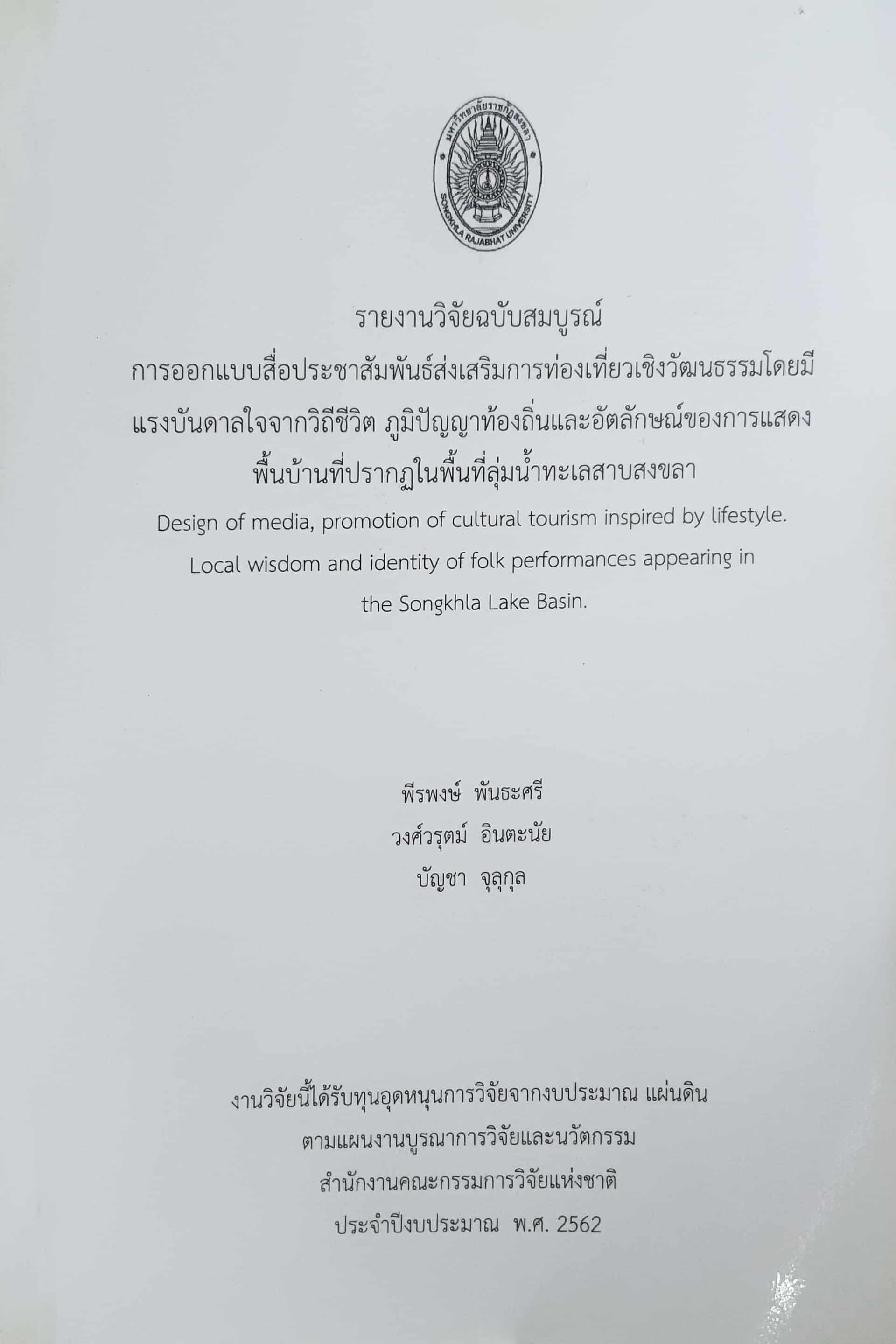 การออกแบบสื่อประชาสัมพันธ์ส่งเสริมการท่องเที่ยวเชิงวัฒนธรรมโดยมีแรงบันดาลใจจากวิถีชีวิต ภูมิปัญญาท้องถิ่นและอัตลักษณ์ของการแสดงพื้นบ้านที่ปรากฎในพื้นที่ลุ่มน้ำทะเลสาบสงขลา : รายงานวิจัยฉบับสมบูรณ์ / พีรพงษ์ พันธะศรี, วงศ์วรุตม์ อินตะนัย, บัญชา จุลุกุล